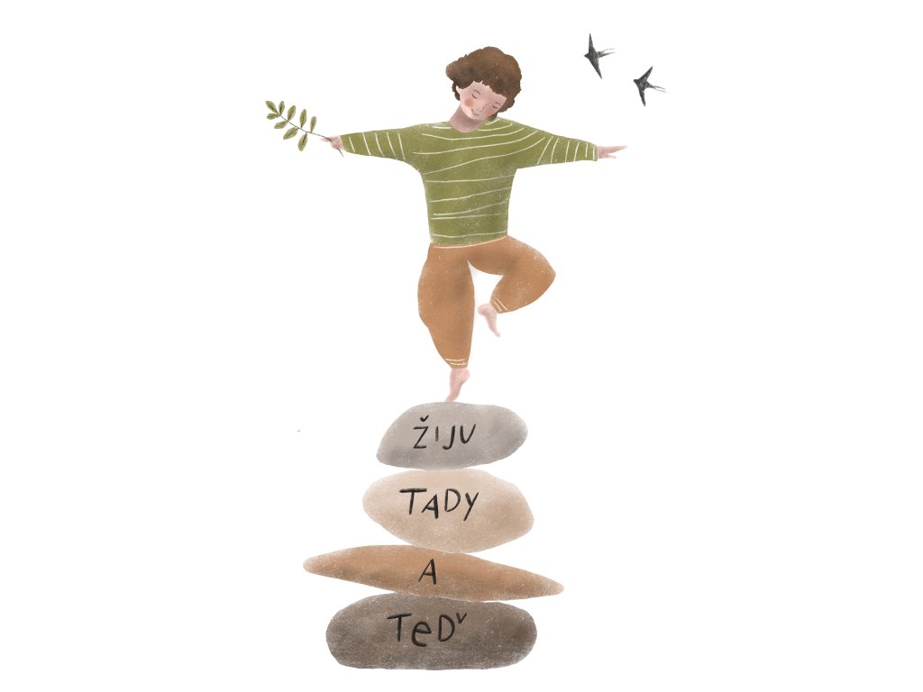 Postavička balancující na kamenech připomíná dětem i dospělým, že štěstí je v obyčejných chvílích - ve hře, smíchu a objevování světa.
